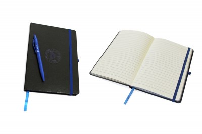 Zápisník s gumičkou a linkovanými listy. S modrými doplňky. Formát A5.