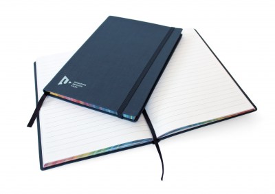 Zápisník s gumičkou a linkovanými listy s duhovými okraji. Formát A5.