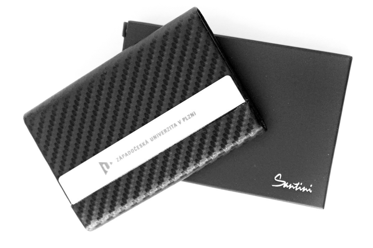 Kvalitní kovový vizitkář zn. Santini s doplňky z imitace kůže.