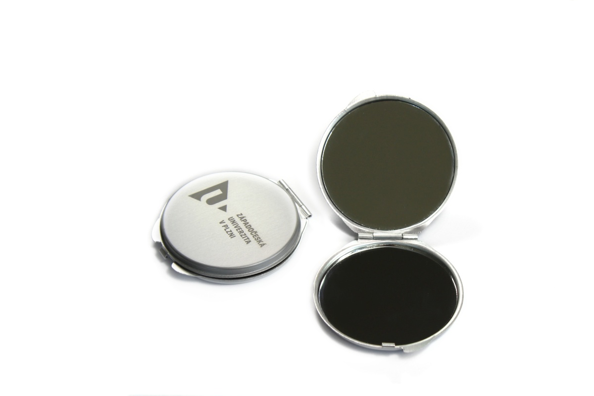 Dvoudílné kapesní zrcátko s klasickým a zvětšovacím sklem. S gravírovaným logem ZČU.