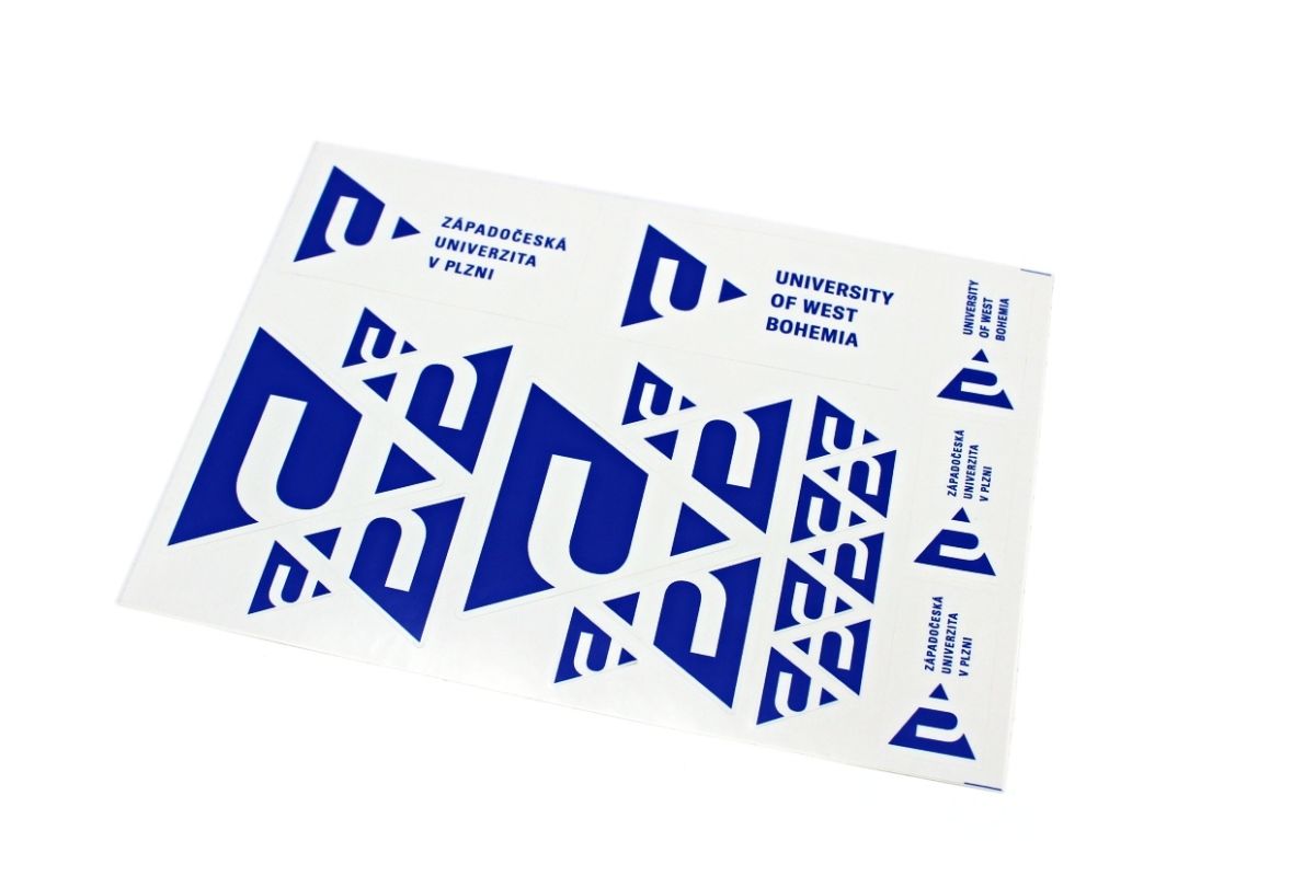 Arch o velikosti A6 obsahuje 22 lakovaných samolepek s logem ZČU - trojúhelníkové samolepky s logem ve třech velikostech a obdélníkové samolepky s logotypem v ČJ i AJ ve dvou velikostech.