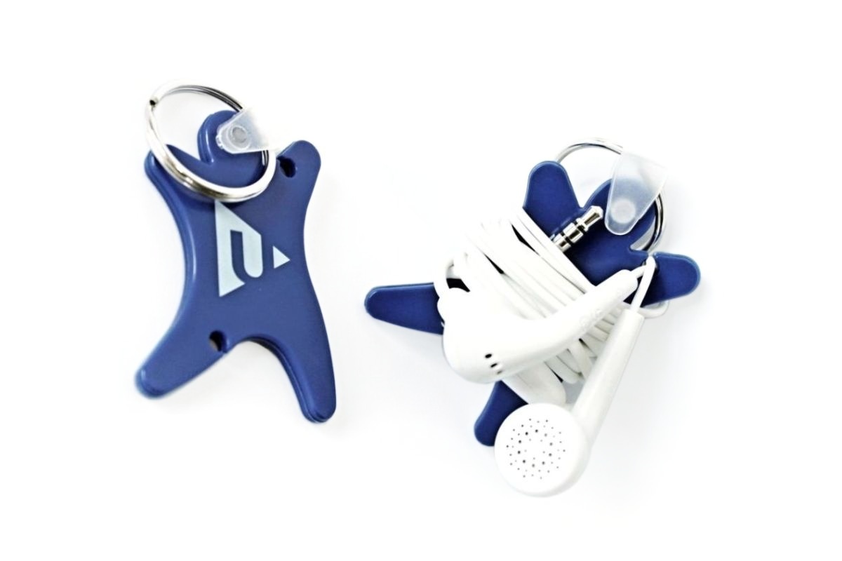 Organizér na sluchátka. Přívěšek na klíče ve tvaru panáčka se dvěma zarážkami. Včetně kroužku na klíče.